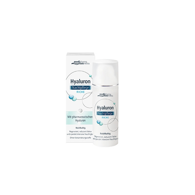 Die Hyaluron Nachtpflege RICHE von medipharma cosmetics unterstützt während der nächtlichen Aufbauphase den wichtigen Regenerierungsprozess der Haut und versorgt diese mit intensiver Feuchtigkeit. Die reichhaltige Textur ist speziell für die empfindliche, trockene bis sehr trockene Haut ausgelegt.