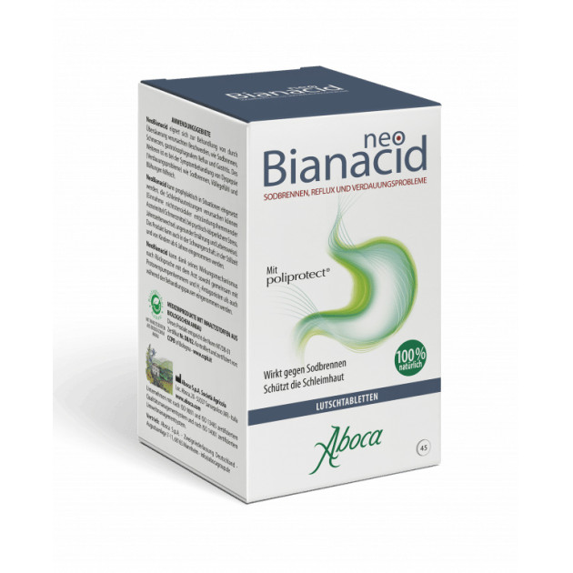 NeoBianacid ist ein Produkt auf Basis pflanzlicher und mineralischer Molekülkomplexe, das schützend und deshalb schmerzlindernd auf die Schleimhaut des Magens und der Speiseröhre wirkt und somit den typischen Symptomen gereizter und entzündeter Schleimhaut wie Sodbrennen, Schmerzen und Säuregefühl rasch entgegenwirkt.