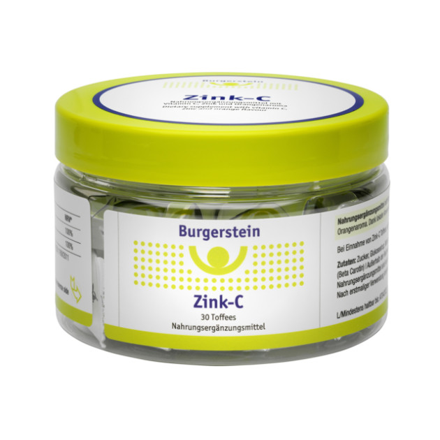 Burgerstein Zink-C sind schmackhafte Toffees zum Lutschen mit Zink, Vitamin C und feinem Orangenaroma. Über die Schleimhäute können Zink und Vitamin C bestens aufgenommen werden. Beide Mikronährstoffe unterstützen die normale Funktion des Immunsystems.