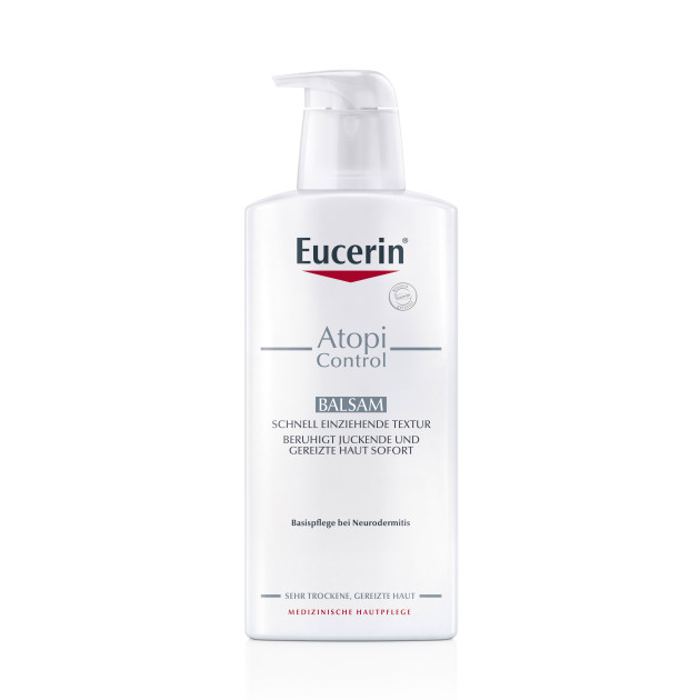 Der Eucerin AtopiControl Balsam für die tägliche Basispflege beruhigt gereizte, sehr trockene und juckende Haut sofort und spendet intensiv Feuchtigkeit. Die schnell einziehende aber dennoch rückfettende Textur enthält natürliche Inhaltsstoffe wie das beruhigende Licochalcone A (Extrakt aus der Süßholzwurzel), Ceramide und Sheabutter, um die Hautbarriere zu stärken und der Trockenheit und dem Juckreiz entgegenzuwirken. Es kann außerdem während einer Schubphase neben der AtopiControl Akutpflege Creme, dem Eucerin Anti-Juckreiz Spray und der gewohnten Medikation verwendet werden.