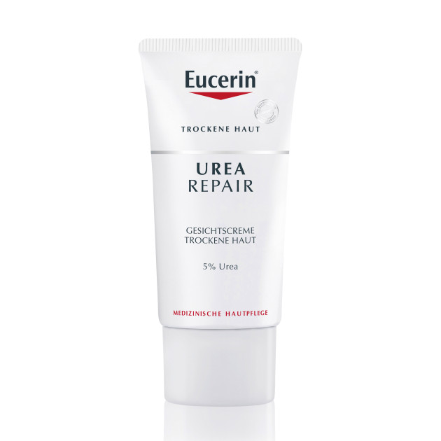 Eucerin UREA REPAIR Gesichtscreme 5% ist eine schnell einziehende Feuchtigkeitspflege für jeden Tag bei trockener bis sehr trockener, zu Schuppung und Spannungsgefühl neigender Haut. Angereichert mit Urea und Lactat, zwei natürlichen, feuchtigkeitsbindenden Präparaten versorgt die Creme trockene Gesichtshaut sofort mit Feuchtigkeit. Das lindert das Spannungsgefühl und macht die Haut spürbar glatter und geschmeidiger. Eucerin UREA REPAIR Gesichtscreme 5% bewahrt die Hautfeuchtigkeit und raue Haut wird glatter. Sie ist ideal als Make-up-Grundlage oder nach dem Rasieren geeignet. Auch bei Psoriasis und Altershaut geeignet.