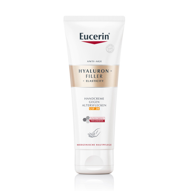 Um das Auftreten von Altersflecken zu reduzieren und ihr erneutes Entstehen zu verhindern, hat Eucerin die HYALURON-FILLER + ELASTICITY Altersfleckenkorrigierende Handcreme entwickelt. Die Pflegecreme zieht gut ein, verbessert die Hautelastizität und spendet der Haut außerdem unglaublich viel Feuchtigkeit. So fühlen Sie Ihre Hände den ganzen Tag lang gepflegt an.