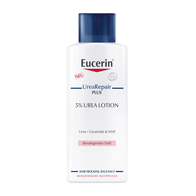 Die Eucerin UreaRepair PLUS Lotion 5% mit beruhigendem Duft enthält den einzigartigen, hautverwandten Repair-PLUS-Komplex: Urea und weitere natürliche Feuchthaltefaktoren (Natural Moisturing Factor = NMF) spenden und binden intensiv Feuchtigkeit und sorgen so für einen gesunden Feuchtigkeitsgehalt der Haut. Zusätzlich stärken Ceramide die physiologische Hautbarriere, damit die Feuchtigkeit nicht entweichen kann. Der hochverträgliche Duft, speziell für die Bedürfnisse trockener Haut entwickelt, ist allergenfrei und beinhaltet hautberuhigende Inhaltsstoffe.