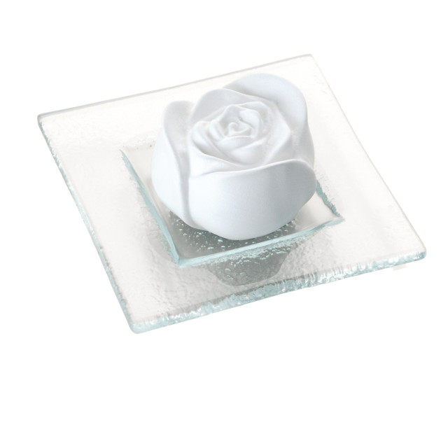 Dieser Duftstein aus Keramik wird mit einem hübschen Glasteller als Untersatz geliefert.