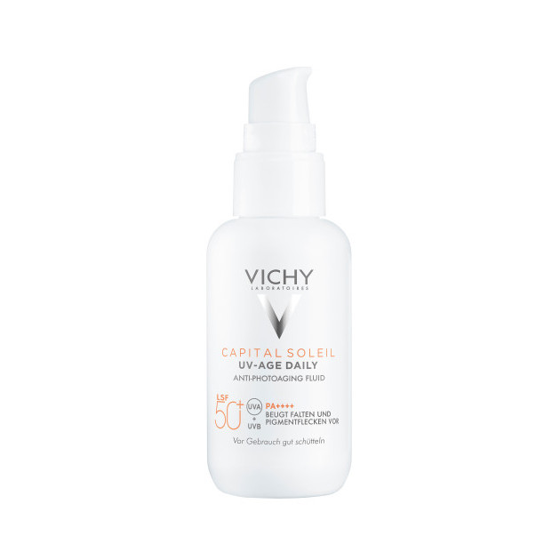 UV-AGE LSF 50+ UVA SF 46 VERLANGSAMT & KORRIGIERT PHOTOAGING, SEHR HOHER LICHTSCHUTZ, SEHR HOHER SCHUTZ VOR UMWELTEINFLÜSSEN, KORRIGIERT FALTEN & PIGMENTFLECKEN, SUPER-LEICHTE TEXTUR
