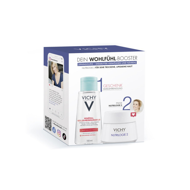 VICHY Influencer Set - Nutrilogie 2 Intensiv-Aufbaupflege für sehr trockene Haut + Pureté Thermale Minéral Mizellen Reinigungsfluid für empfindliche Haut 100ml. VICHY Nutrilogie 2 Intensiv-Aufbaupflege für sehr trockene, lipidarme Haut. Trockene Haut ist nicht in der Lage, die hauteigenen Lipide (Fette) in ausreichendem Maße zu produzieren. Nutrilogie 2 pflegt trockene Haut intensiv und reduziert Spannungsgefühle. Wohlbefinden und Geschmeidigkeit ab der ersten Anwendung. Pureté Thermale Minéral Mizellen Reinigungsfluid für empfindliche Haut 100ml. Ein intensives Mizellen Reinigungsfluid mit vulkanischem Wasser aus Vichy und beruhigendem Panthenol.